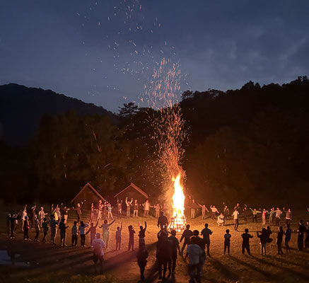 夜のレクリエーションはキャンプファイヤー。輪になって踊り、歌い、笑い合い、思い出に残るひとときとなりました。